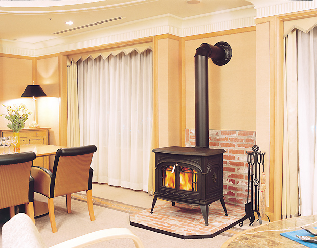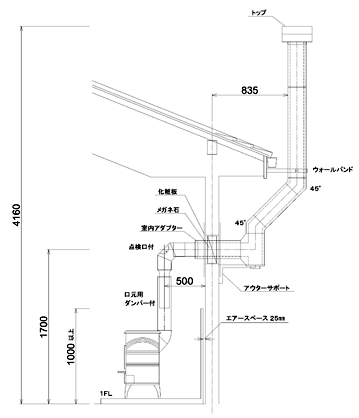 1階に薪ストーブを設置し、煙突を1階 の壁から出すプランです。(1階建て用)屋外煙突色はステンレス色の他、黒耐熱焼付塗装もあります。